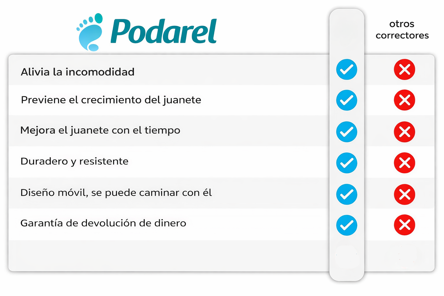 Los juanetes pueden causar dolor constante y empeorar con el tiempo si no se tratan, llegando incluso a requerir cirugía. El corrector Podarel ayuda a aliviar las molestias y a realinear el dedo con solo 30 minutos de uso diario